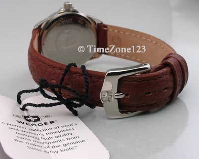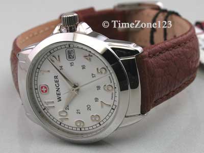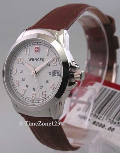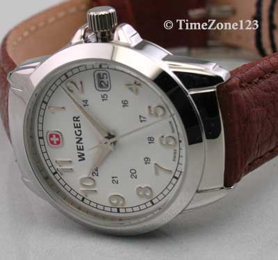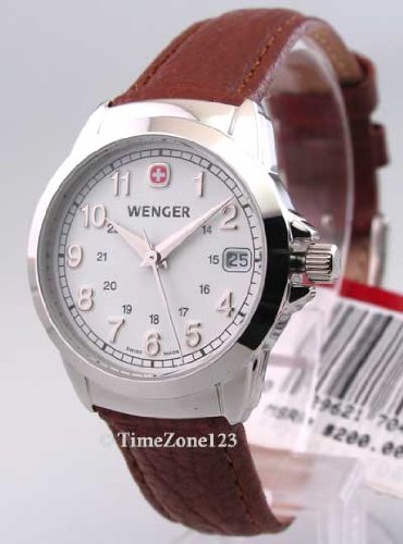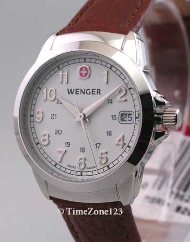 * All Stainless Steel Case & Buckle * Stitched Brown Genuine Leather Band * Analog with Silver Hands & Markers * Smart Round Snow White E-Z Read Face & 24 Hour Military Time Markers * Rotating Second Hand * Swiss Army Emblem at "12" Position * Date at "3" Position * S ee Also Style #70459 * Precision Swiss Quartz Movement * Quality Swiss Made * Movement Accurate to 1/2 of a Second per Day * 5 ATM - 50 m - 165 ft - Water Resistant * Domed Scratch Resistant Mineral Crystal * Guaranteed 100% Authentic wenger Watch * Brand New - Never Worn - In Genuine wenger Swiss Army Metal Tin * Retail Price: $200.00 **** Watch Stats**** [FACE] * Style: Analog * Shape: Round * Size: L x W 15/16" * Color: Snow White * Hands: Silver * Hour Markers: Silver Numbers * Misc: Rotating Second Hand Date at "3" Position Swiss Army Emblem at "12" Position [BAND] * Material: Genuine Leather * Wrist Size: 5-1/2" to 7" * Width: 1/2" * Color: Brown * Clasp: Buckle Clasp * Misc: Stitched Genuine Leather
